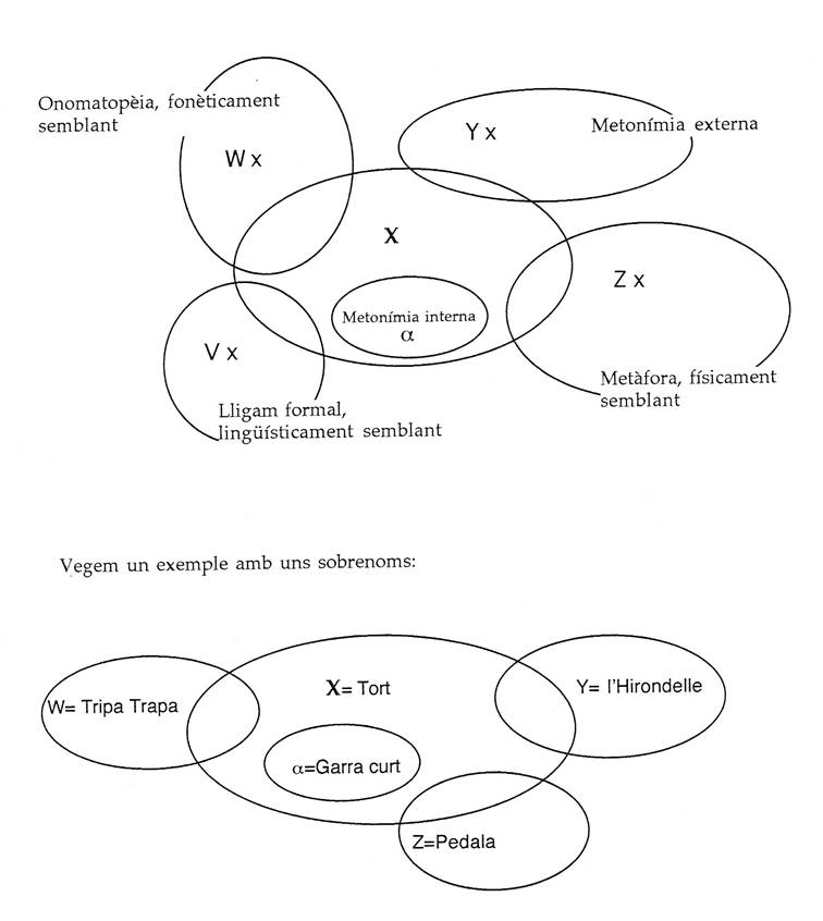 [1] Ja hem vist com és freqüent extreure del discurs de l'individu un mot (estrany, diferent o esguerrat) per fer-ne un sobrenom.