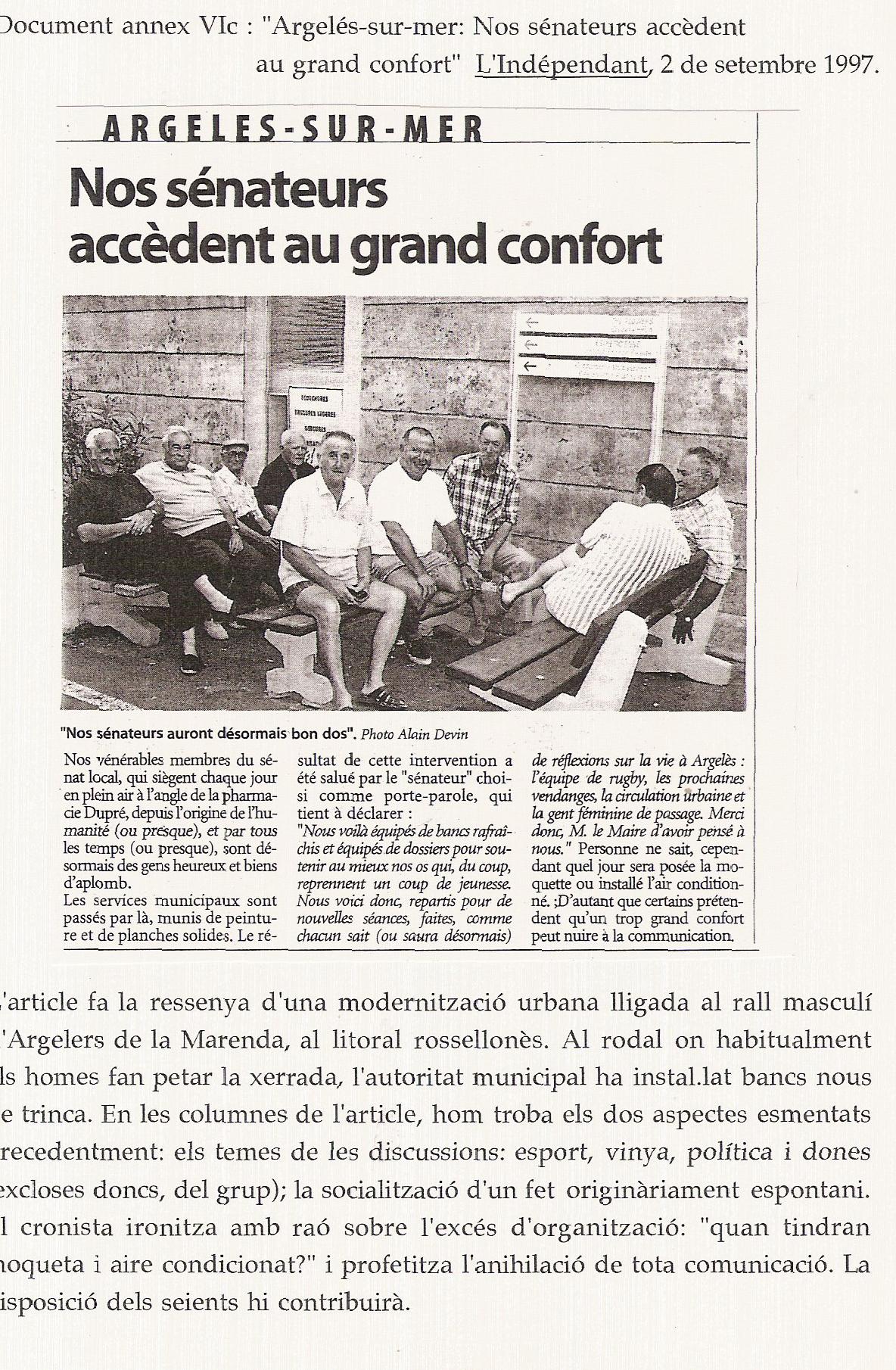 Il·lustrat per una foto d'un grup d'homes assentats sobre tres bancs paral·lels, l'article fa la ressenya d'una modernització urbana lligada al rall masculí d'Argelers de la Marenda, al litoral rossellonès.