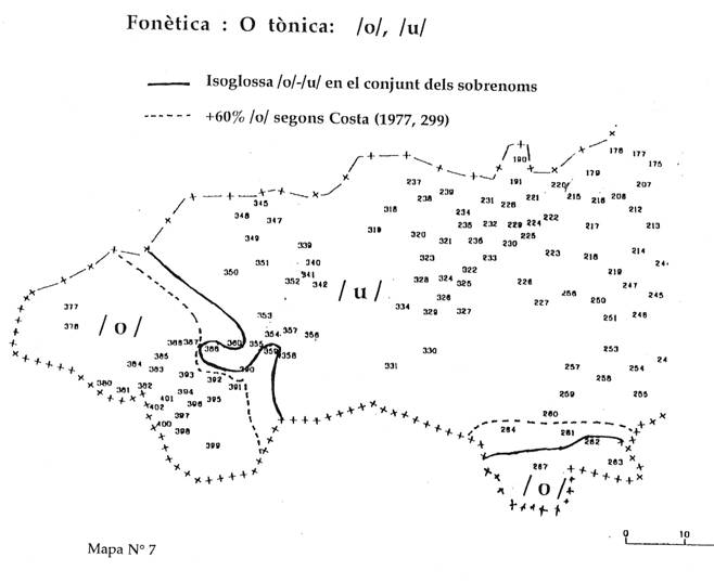 Aquests límits no coincideixen amb els que dibuixa el mapa 'berger' del Sacaze . El so /u/ hi era més present; és com si hagués perdut terreny. De la mateixa manera, si contrastem la isoglossa que apareix en l'article de Costa (1977, 299) sobre el tancament de la /o/ i els nostres sobrenoms, ens adonem d'un avanç (3 pobles més) de la /o/ a Cerdanya. En canvi, a l'Alt Vallespir, constatem la pèrdua de dos vilatges.