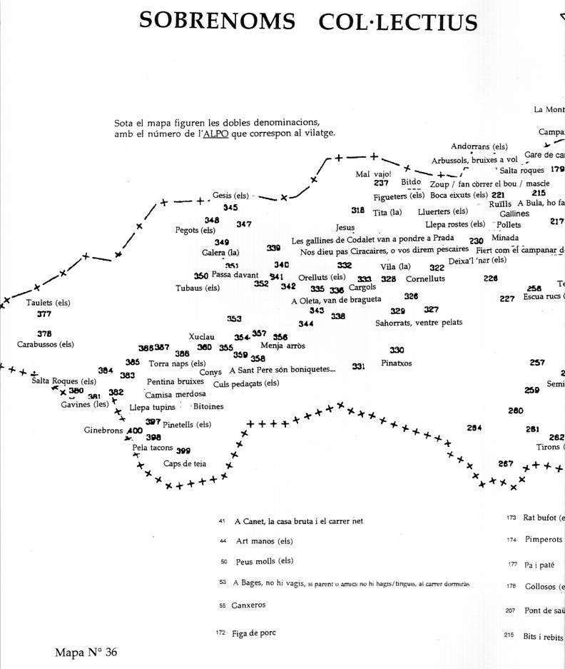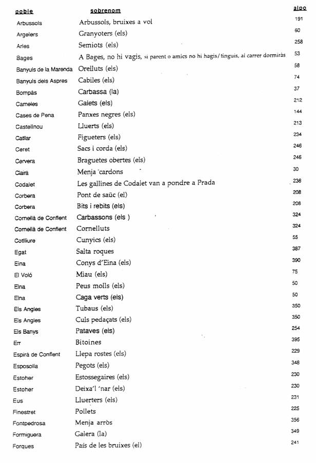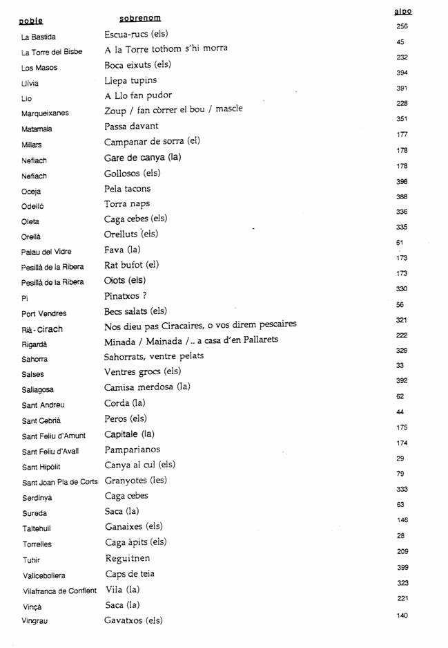 - de cops el sobrenom és disfressat, maquillat i un foraster el prendria per veritable gentilici. Rellevem els Nyarros d'Alenyà, els Estossegaires d'Estoher, els Cornelluts de Cornellà de Conflent i d'Orellà...els Orelluts.