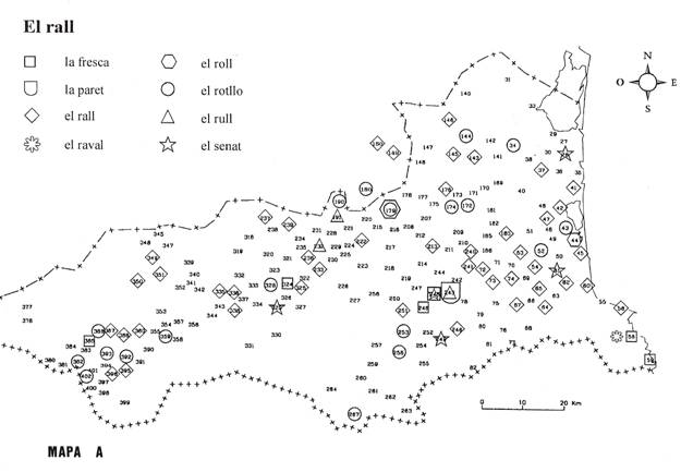 La varietat de denominacions que apareix al mapa A, fa impossible discernir tal o tal preferència segons la comarca. Ens adonem que "rall" domina i passa a Occitània. Trobem rastres esporàdics de "rotllo" a tot el territori, i en canvi, "rull" i "roll" són molt escassos. "Senat" confereix a l'assemblea masculina un paper més prestigiós, recolzat per la "premsa" local.